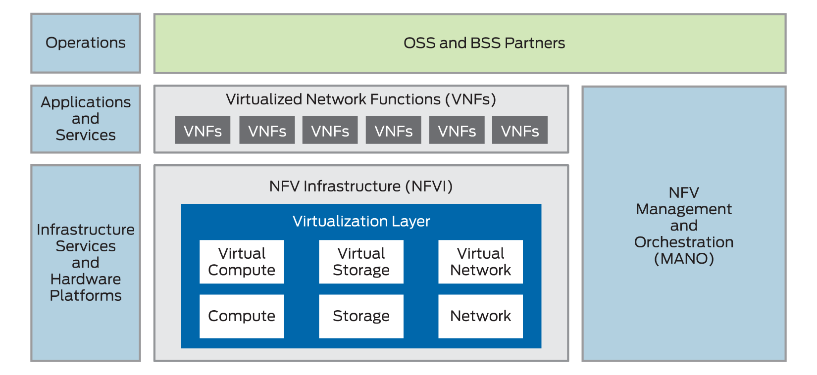MANO(Management and orchestration) — NFV 아키텍처에서 매우 중요한 VNF의 관리 및 오케스트레이션을 제공합니다. MANO는 VNF 및 오버레이 네트워크 서비스 체인을 인스턴스화하는 VIM 및 VNF 관리자에 대한 워크플로우의 자동화, 프로비저닝 및 조율을 통해 네트워크 서비스를 인스턴스화합니다. MANO는 NFV 아키텍처와 기존 OSS/BSS를 연결합니다.