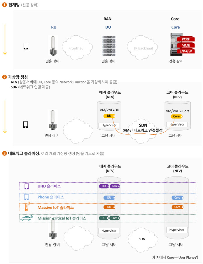 ❷ N네트워크 슬라이스가 만들어질려면 우선 제공되어야 할 기술이 NFV(네트워크 기능 가상화)이다. 네트워크 장비가 아닌 가상화된 상용 서버(COTS)에 Network Function S/W (Packet Core의 MME, S/P-GW, PCRF, RAN의 DU)을 VM에 탑재한다(이게 NFV죠). 그러면 RAN은 에지 클라우드가 되고 Core는 코어 클라우드가 된다. 에지 클라우드와 코어 클라우드에 있는 VM들간의 네트워크 연결은 SDN으로 설정한다.