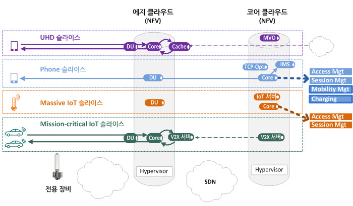 - Phone 슬라이스의 코어 클라우드에는 Full Mobility 기능이 다 들어간 5G Core (UP, CP)와 IMS 서버가 가상화되어 탑재되고 Massive IoT slice (예, 센서 네트워크)에는 Mobility Management는 필요없는 가벼운 5G Core가 탑재된다.