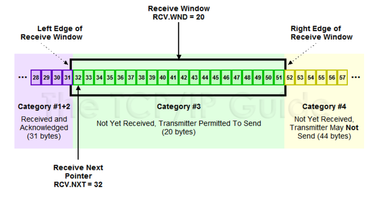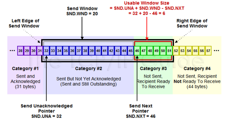 •송신 비확인(SND,UNA) - 송신 했지만 아직 승인되지 않는 첫 번째 데이터의 순서번호. - 전송카테고리 2의 첫 번째 바이트를 가리킨다. - 앞의 순서 번호는 모두 전송 카테고리 1에 속한다.