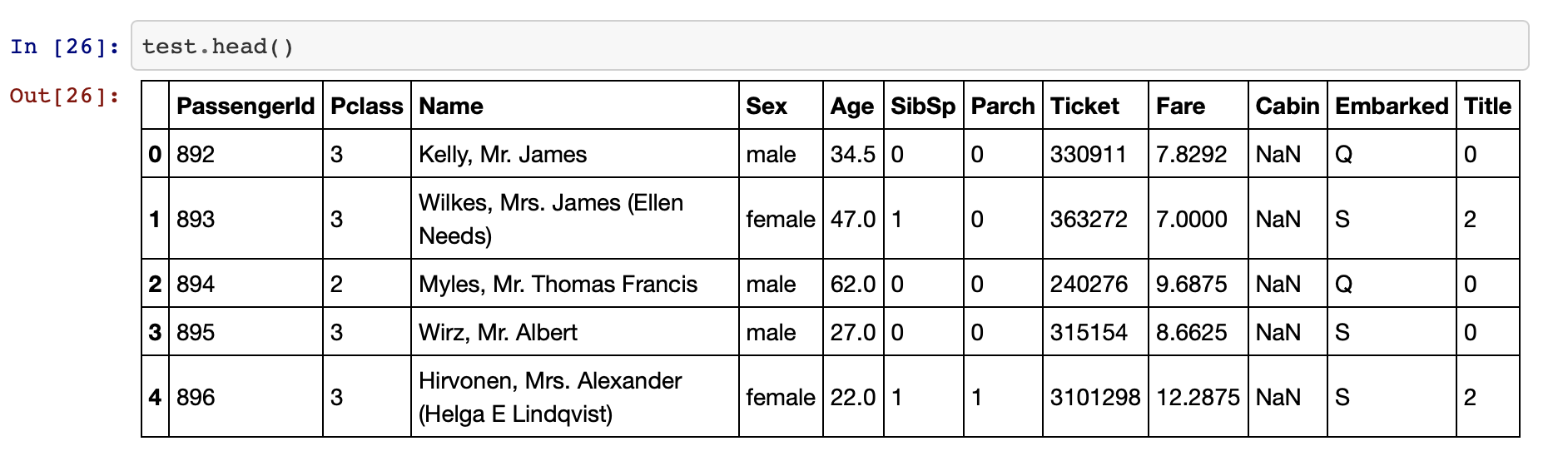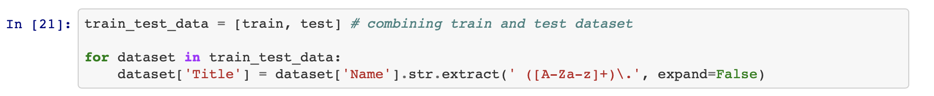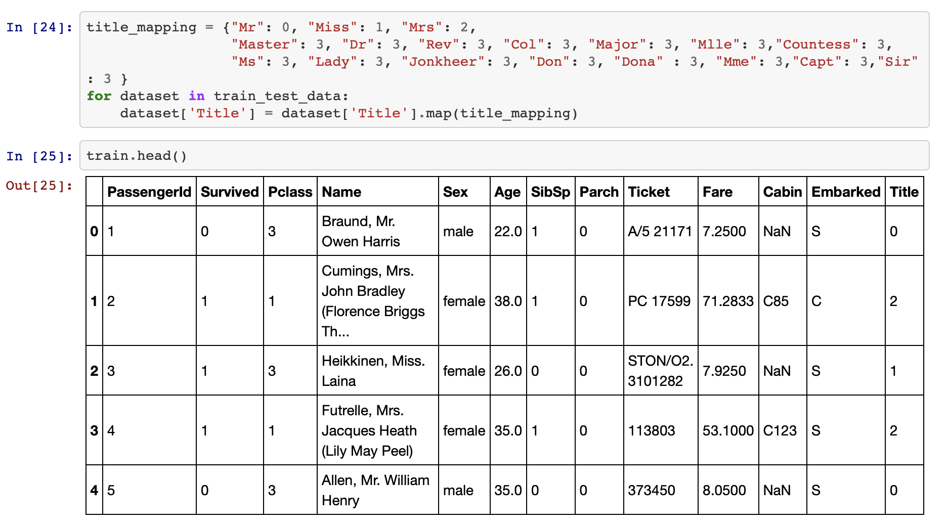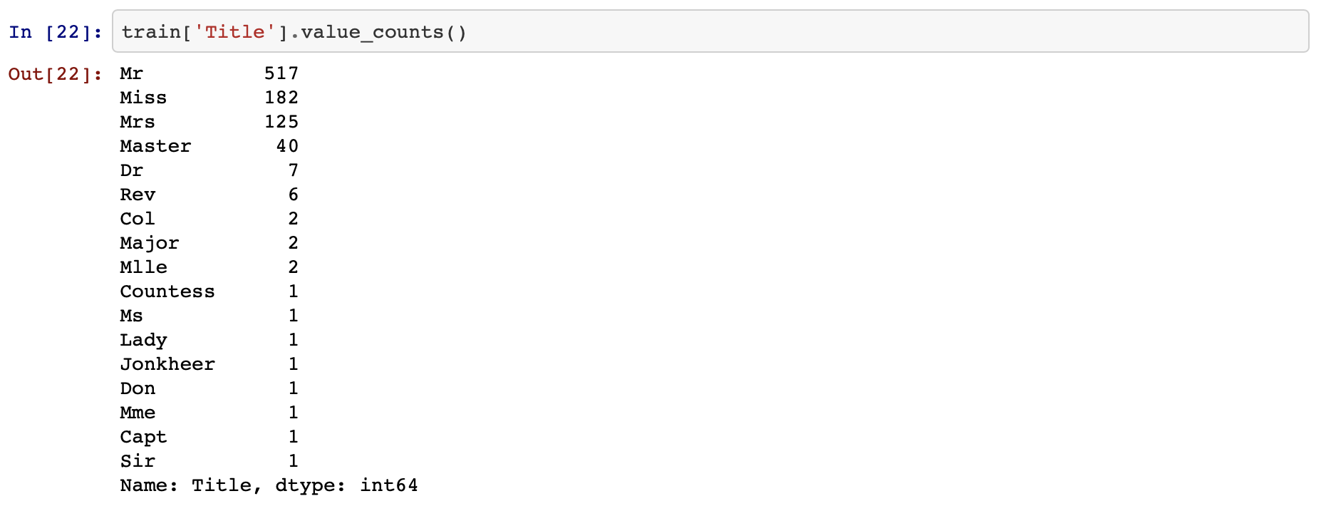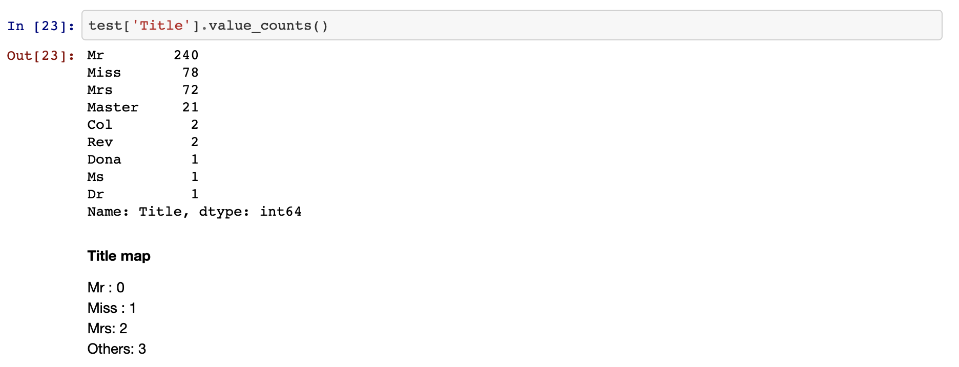 다음처럼 Mr, Miss, Mrs, Others로 4개로 나뉘어 feature vector를 만들어 비교를 설정합니다. 이를 위해서 모든 이름을 분류한 것입니다.