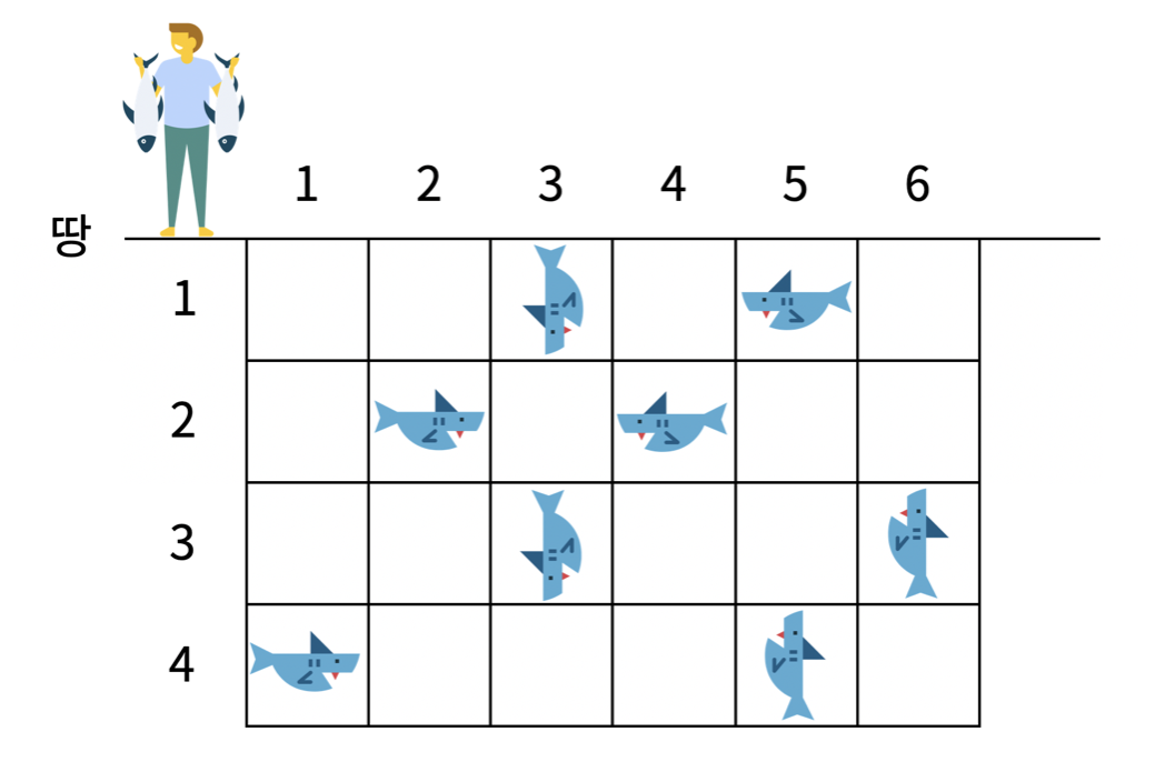 - 낚시왕이 있는 열에 있는 상어 중에서 땅과 제일 가까운 상어를 잡는다. 상어를 잡으면 격자판에서 잡은 상어가 사라진다.