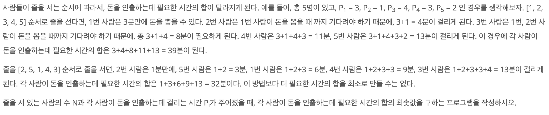 ATM에서 한 사람당 인출할 때 소요되는 시간이 주어진다. 이때 순서대로 인출을 진행되야되며 한 사람이 인출하는 동안 다른 사람은 인출하지 못한다. 즉 인출하는 동안 뒤에 순서에 있는 사람은 기다려야 한다는 것이다.