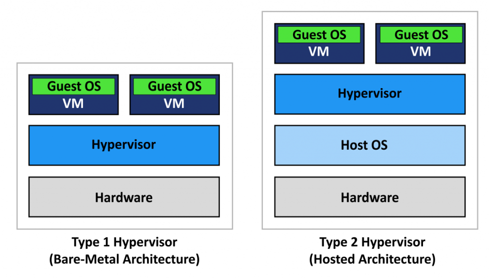 서버 가상화는 서버의 효율성을 올리기 위해 등장하였고, 가상화 개념의 시초라고 할 수 있습니다. 서버가상화는 하이퍼바이저(Hypervisor)와 가상머신 (VM)으로 이루어 집니다. 하이퍼바이저란 하드웨어로부터 제공되는 물리적인 레이어를 추상화하고, 가상머신을 통해 기능들을 사용하도록 해줍니다. 하이퍼 바이저는 Type1, Type2 로 구분되는데 이에 대한 설명은 다음 블로그에 더 자세히 다루도록 하겠습니다.