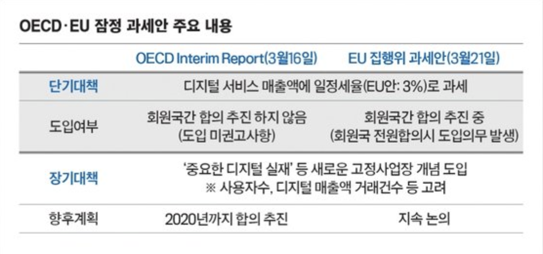 이런 안은 회원국 사이에서도 견해가 엇갈려 부결됐다. 다만 EU 집행위원회는 디지털세 법안이 통과될 때까지 임시 조치로서 3% 세율의 ‘디지털 서비스세(Digital Service Tax)’를 부과할 계획이라 밝혔다. 디지털 서비스세 역시 아일랜드·네덜란드·룩셈부르크 등 일부 회원국들이 강력히 반대하고 있어 아직 발효 여부는 불분명하다. 더욱이 미국은 EU 디지털세가 자국 IT 기업을 겨냥하고 있다며 강하게 반발하고 있어 논란은 더욱 커질 수 있다.