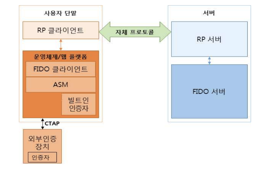 FIDO(Fast IDentity Online) 시스템은 FIDO서버, FIDO클라이언트, ASM(Authenticator Specific Module), 인증자(Authenticator)로 구성되어 있습니다.