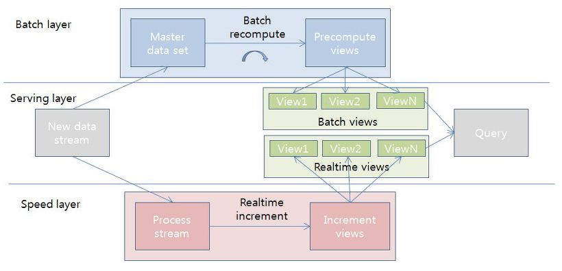 람다아키텍처는 나르단 마르츠(Nathan Marz)가 트위터에서의 분산프로세싱 경험을 바탕으로 스피드레이어(Speed Layer)+배치레이어(Batch Layer)+서빙레이어(Serving Layer)로 3계층으로 구성된 실시간처리 아키텍처입니다.