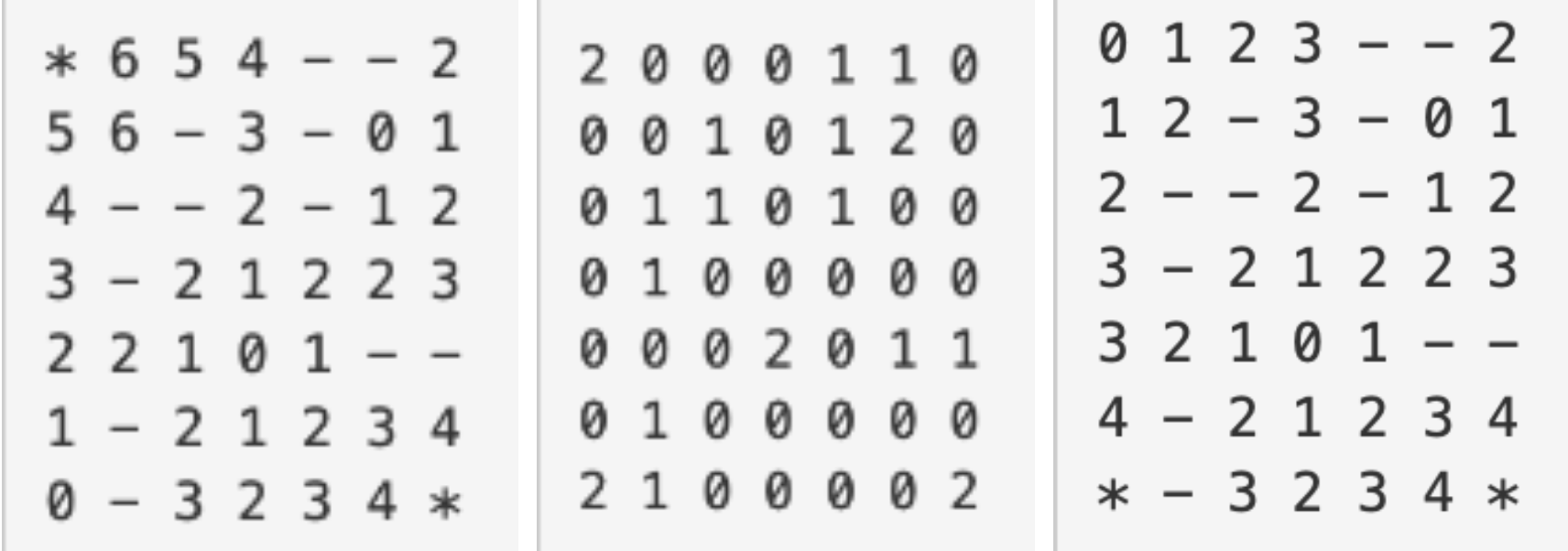 M = 3, 벽은 -, 비활성 바이러스는 *, 활성 바이러스는 0, 빈 칸은 바이러스가 퍼지는 시간으로 표시.