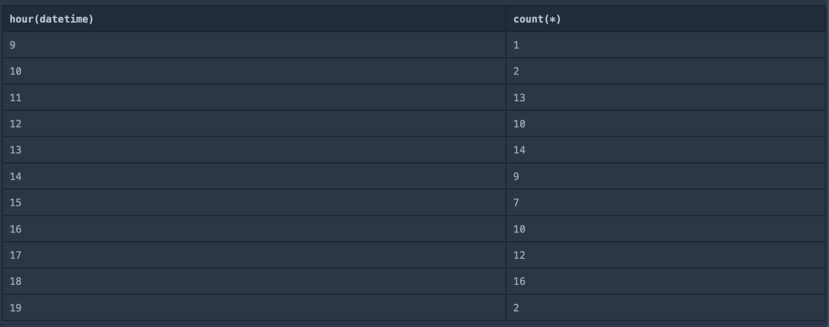 SELECT hour(datetime),count(*)