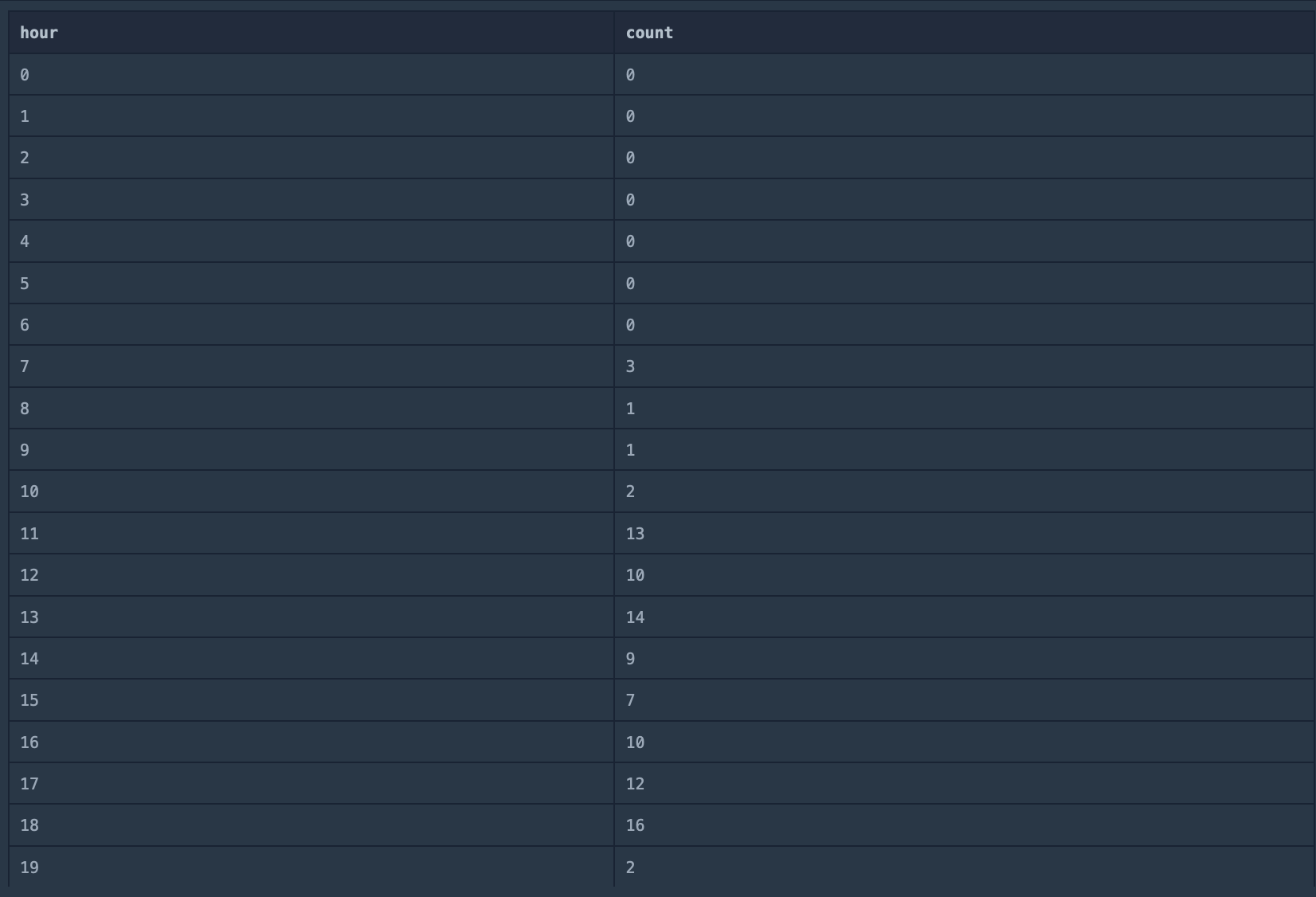 select (@time := @time +1)as 'hour', (select count(*)