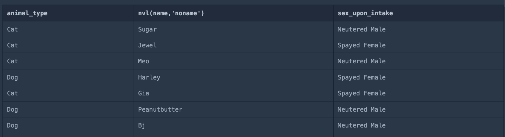 SELECT animal_type,nvl(name,'No name'),sex_upon_intake