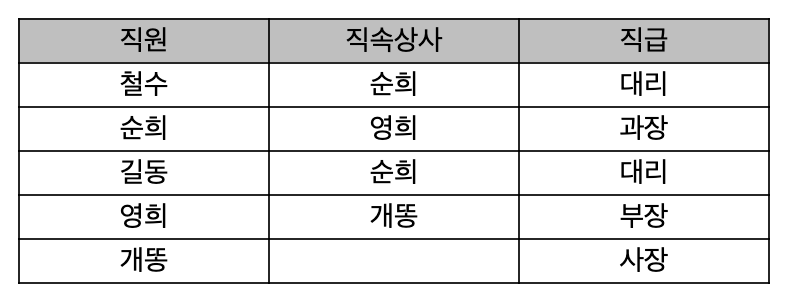 그 이유는 " 방금 전 행의 직속상사 값이 현재 행의 직원 값인 모든 행을 찾아라"라고 선언했기 때문이다.