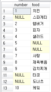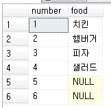 여기서 NULL이 출력하는 과정을 한번 더 자세하게 알아보자면, [ NULL / 타코 ] 레코드를 예로 들었을 떄, number = NULL 입니다. 따라서 NOT EXISTS 이하의 쿼리를 확인해보면 다음과 같을 것 입니다.