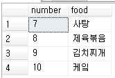 이후에는 TB_FOOD에서 하나의 레코드를 가져오며 그 레코드의 number 값이 앞에서 가져온 IN 이하의 요소들에 포함되어 있는지를 체크합니다. 그리고 IN 이하의 요소들 중 하나라도 일치한다면 그 레코드를 출력하게 되는 것이죠.