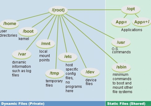 파일과 디렉토리는 카테고리별로 조직화되어 있습니다. 위 그림에서 가장 분명하게 알 수 있는 카테고리는 고정(static)과 유동(dynamic)적인 파일들입니다. 또한 다른 카테고리로는 실행가능 여부, 환경설정, 데이터 파일들 등이 있습니다. 시스템 관리자라는 입장에서 볼 때, 이와 같은 파일 시스템 구조는 관리하기에 적합합니다.