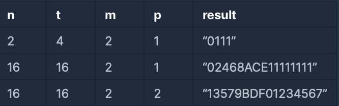 풀이법은 간단합니다. t는 구해야 하는 개수가 되기때문에 돌려말하면 t번의 턴 만큼 진행한다는 것입니다. 또한 전체 맴버의 수가 m이므로 m*t만큼의 진수 리스트를 구해주시면 됩니다.