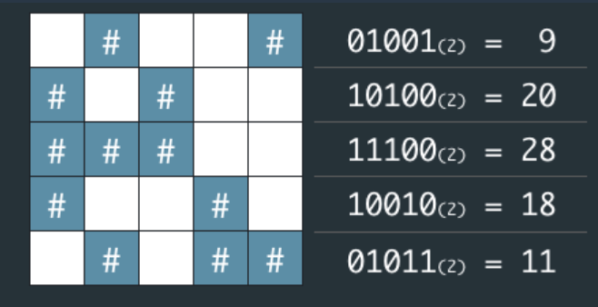 4. 암호화된 배열은 지도의 각 가로줄에서 벽 부분을 1, 공백 부분을 0으로 부호화했을 때 얻어지는 이진수에 해당하는 값의 배열이다.