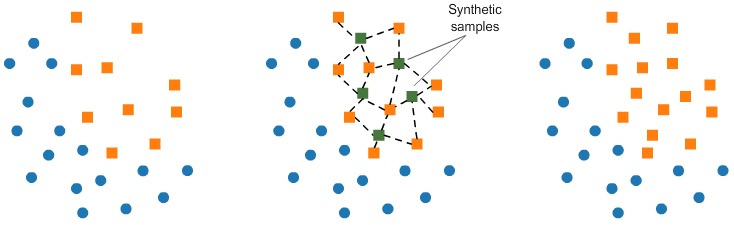 SMOTE는 적은 데이터 셋에 있는 개별 데이터들의 K 최근접 아웃(K Nearest Neighbor)을 찾아서 이 데이터와 K개 이웃들의 차이를 일정 값으로 만들어서 기존 데이터와 약간 차이가 나는 새로운 데이터들을 생성하는 방식이다.