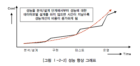 성능 향상을 위한 비용은 프로젝트 수행 중에 있어서 사전에 할수록 비용이 들지 않는다. 특히 분석/설계 단계에서 데이터 모델에 성능을 고려한 데이터 모델링을 수행할 경우 성능저하에 따른 재업무(Rework) 비용을 최소화 할 수 있는 기회를 가지게 된다