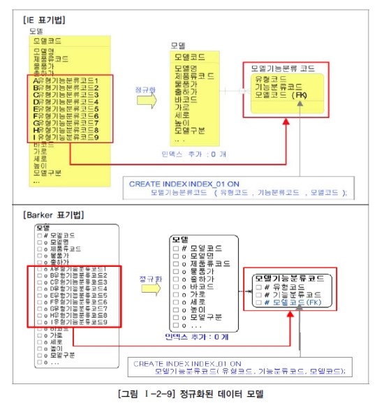 각 유형별로 모두 인덱스가 걸려 있어야 인덱스에 의해 데이터를 찾을 수 있다. 이런 모델은 다음과 같이 정규화를 적용해야 한다. 중복속성에 대한 분리가 1차 정규화의 정의임을 고려하면 모델 테이블은 1차 정규화의 대상이 된다. 로우단위의 대상도 1차 정규화의 대상이 되지만 칼럼 단위로 중복이 되는 경우도 1차 정규화의 대상이 된다.따라서 모델에 대해 1차 정규화를 적용하면 그림 Ⅰ-2-9와 같이 분리될 수 있다.