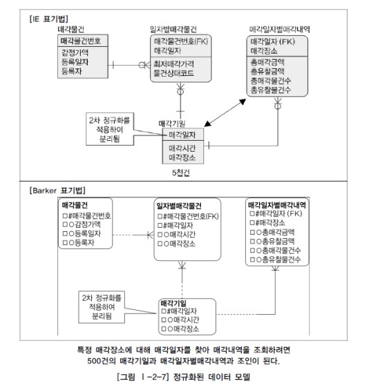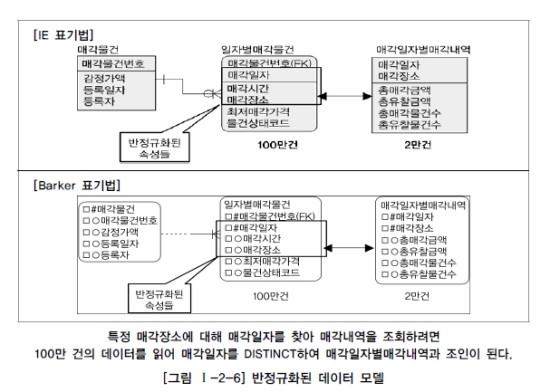 두 개의 엔터티가 통합되어 반정규화된 또 다른 경우를 살펴본다. 이 업무에서는 어떤 물건을 매각할 때 매각일자를 정하고 그 일자에 해당하는 매각시간과 매각장소가 결정하는 속성의 성격을 가지고 있다.즉 매각일자가 결정자가 되고 매각시간과 매각장소가 의존자가 되는 함수적 종속관계가 형성되는 관계이다.매각일자는 5천 건이 있고 일자별매각물건은 100만 건이 있는 것으로 가정하자.