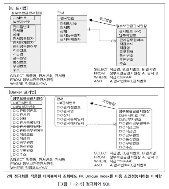 그림 Ⅰ-2-5에서와 같이 왼쪽 테이블에서는 불필요하게 납부자번호 만큼 누적된 데이터를 읽어서 결과를 구분하여 보여주어야 하지만 오른쪽은 관서수 만큼만 존재하는 데이터를 읽어 곧바로 결과를 보여주기 때문이다. 이렇게 단순한 예만 보아도 정규화를 수행하면 무조건 조회성능이 저하된다는 고정관념이 틀렸다는 것을 알 수 있다.