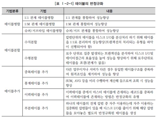 - 대량의 데이터처리나 부분처리에 의해 성능이 저하되는 경우에 클러스터링을 적용하거나 인덱스를 조정함으로써 성능을 향상시킬 수 있다.클러스터링을 적용하는 방법은 대량의 데이터를 특정 클러스터링 팩트에 의해 저장방식을 다르게 하는 방법이다. 이 방법의 경우 데이터를 입력/수정/삭제하는 경우 성능이 많이 저하되므로 조회중심의 테이블이 아니라면 생성하면 안되는 오브젝트이다. 다만, 조회가 대부분이고 인덱스를 통해 성능향상이 불가능하다면 클러스터링을 고려할 만하다. 또한 인덱스를 통해 성능을 충분히 확보할 수 있다면 인덱스를 조정하여 반정규화를 회피하도록 한다.