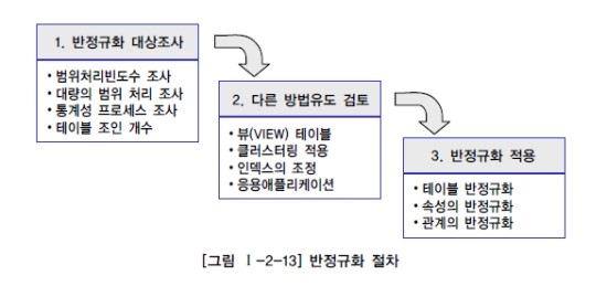 반정규화를 적용하기 위해서는 그림 Ⅰ-2-13에 나타난 것처럼 먼저 반정규화의 대상을 조사하고 다른 방법을 적용할 수 있는지 검토하고 그 이후에 반정규화를 적용하도록 한다.