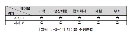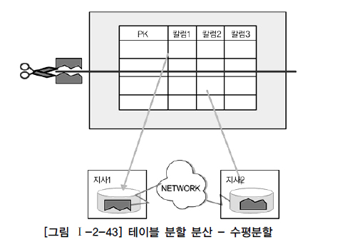 - 지사별로 데이터베이스를 운영하는 경우 : 데이터베이스가 속한 서버가 지사에 존재하던지 아니면 본사에 통합해서 존재하건 간에 데이터베이스 테이블들은 수평 분할하여 존재