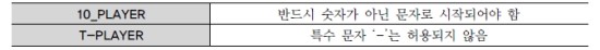 제약조건 : 기본키(PRIMARY KEY) → PLAYER_ID (제약조건명은 PLAYER_ID_PK)