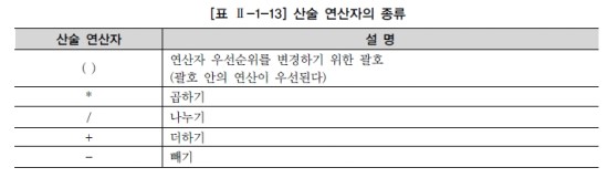 산술 연산자는 수학에서와 같이 (), *, /, +, - 의 우선순위를 가진다.