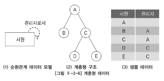 (2) 계층형 구조 : A의 하위 사원은 B, C이고 B 밑에는 하위 사원이 없고 C의 하위 사원은 D, E 가 있음
