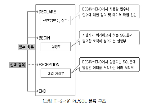 - EXCEPTION : BEGIN ~ END 절에서 실행되는 SQL문이 실행될 때 에러가 발생하면 그 에러를 어떻게 처리할 것이지를 정의하는 예외 처리부이다.