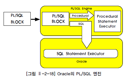 그림 Ⅱ-2-18은 PL/SQL Architecture이다. PL/SQL Block 프로그램을 입력받으면 SQL 문장과 프로그램 문장을 구분하여 처리한다. 즉 프로그램 문장은 PL/SQL 엔진이 처리하고 SQL 문장은 Oracle 서버의 SQL Statement Executor가 실행하도록 작업을 분리하여 처리한다.