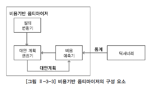 그림 Ⅱ-3-3 비용기반 옵티마이저는 질의 변환기, 대안 계획 생성기, 비용 예측기 등의 모듈로 구성