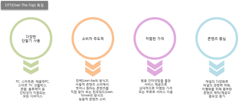OTT(Over The Top)서비스는 기존의 통신 및 방송 사업자, 제3사업자들이 인터넷을 통해 드라마나 영화 등의 다양한 미디어 콘텐츠서비스를 말합니다.