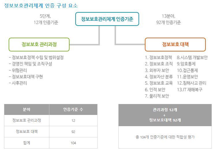ISMS 구성 요소입니다. 위의 인증 기준수를 만족하는 것이며, 13가지 분야의 104개 항목을 가지고 있다. 104가지의 항목을 만족시키고, 이에 대한 증빙 및 문서를 가지고 있어야 인증이 가능하다.