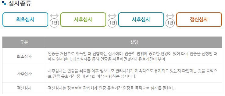 심사종료또한 기존의 ISMS, PIMS 와 동일합니다. 최초심사후 3년, 매년1회별 사후심사, 매년1회 갱신심사 결국적으로 거의 매년 심사를 받아서 갱신, 사후심사 를 받아야 한다는 것입니다.