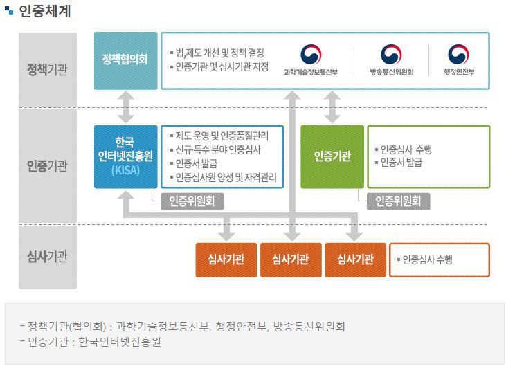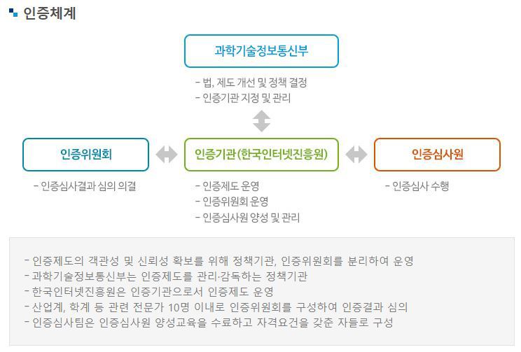 이는 제 3의 인증기관이 객관적, 독립적으로 관리체계를 평가하여, 관련 기준에 대한 적합 여부를 보증합니다. ISMS인증과 관련하여 정책기관은 미래창조과학부, 인증기관은 한국인터넷진흥원으로 관련 업무를 주관하고 있습니다.